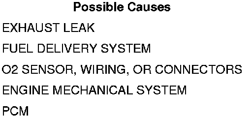 • Set Condition: The conditions that cause this diagnostic to fail is when the upstream O2 sensor becomes biased from an exhaust leak, O2 sensor contamination, or some other extreme operating condition. The downstream O2 sensor is considered to be protected from extreme environments by the catalyst. The PCM monitors the downstream O2 sensor feedback control, called downstream fuel trim, to detect any shift in the upstream O2 sensor target voltage from nominal target voltage. The value of the downstream fuel trim is compared with the lean thresholds. Every time the value exceeds the calibrated threshold, a fail timer is incremented and mass flow through the exhaust is accumulated. If the fail timer and accumulated mass flow exceed the fail thresholds, the test fails and the diagnostic stops running for that trip. If the test fails on consecutive trips, a DTC is set.