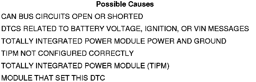 • Set Condition: Bus messages not received from the Totally Integrated Power Module (TIPM) for approximately two to five seconds.
