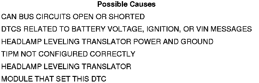 • Set Condition: Bus messages not received from the Headlamp Leveling Translator for approximately two to five seconds.