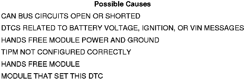• Set Condition: Bus messages not received from the Hands Free Module (HFM) for approximately two to five seconds.