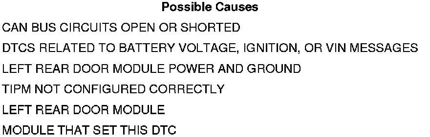 • Set Condition: Bus messages not received from the Left Rear Door Module for approximately two to five seconds.