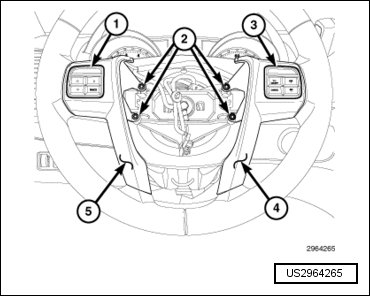 - From the face of the steering wheel, remove the screws (2) as needed, that secure the front spoke bezel (5) to the steering wheel armature within the steering wheel hub cavity.