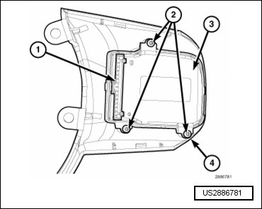 - Position the Electronic Vehicle Information center (EVIC) switch pod (3) to the back of the steering wheel spoke front bezel (4).