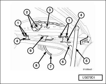 - Route the rear wiper washer hose (8) through the hole in the rear header panel (6) and engage the grommet.