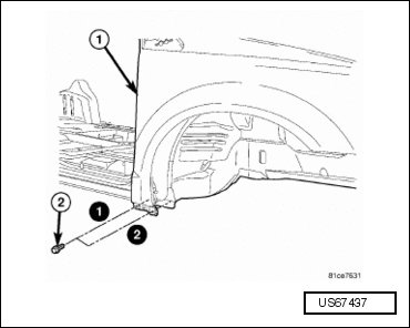 - Install the fender (1) to rocker panel bolt (2) and tighten to 12.5 Nm (9 ft lbs).