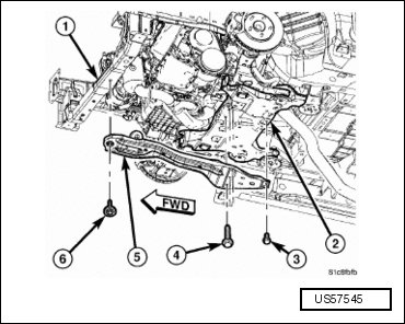 - Remove crossmember front mounting bolt (6).