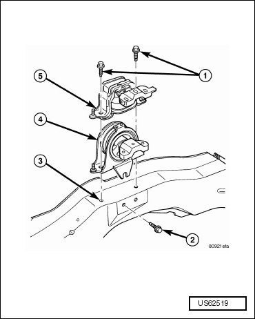 The powertrain mounting system consists of four mounts. The right and left side mounts support the powertrain, and the front and rear mounts control the powertrain torque. The right side mount (5) is a hydro-type mount, all others are a molded rubber material.