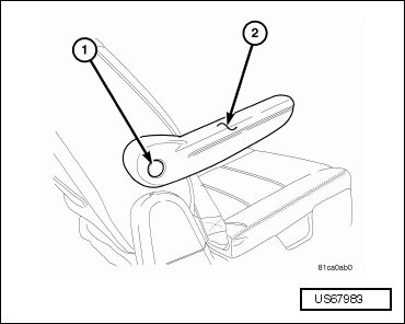 - Using a small flat bladed tool, pry the cap (1) from the side of the armrest (2).