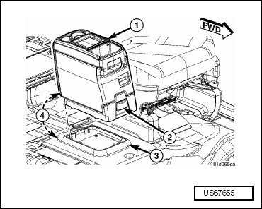 - Pull rearward to disengage the console from the floor and remove the console (1).