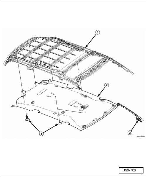 - Remove the push pins (4) holding the headliner (2) in place.