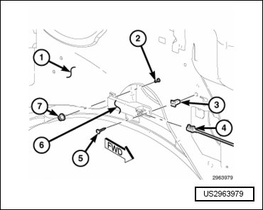 - Remove the nut (7) that secures the LF antenna to the weld stud (2) on the left quarter inner panel.