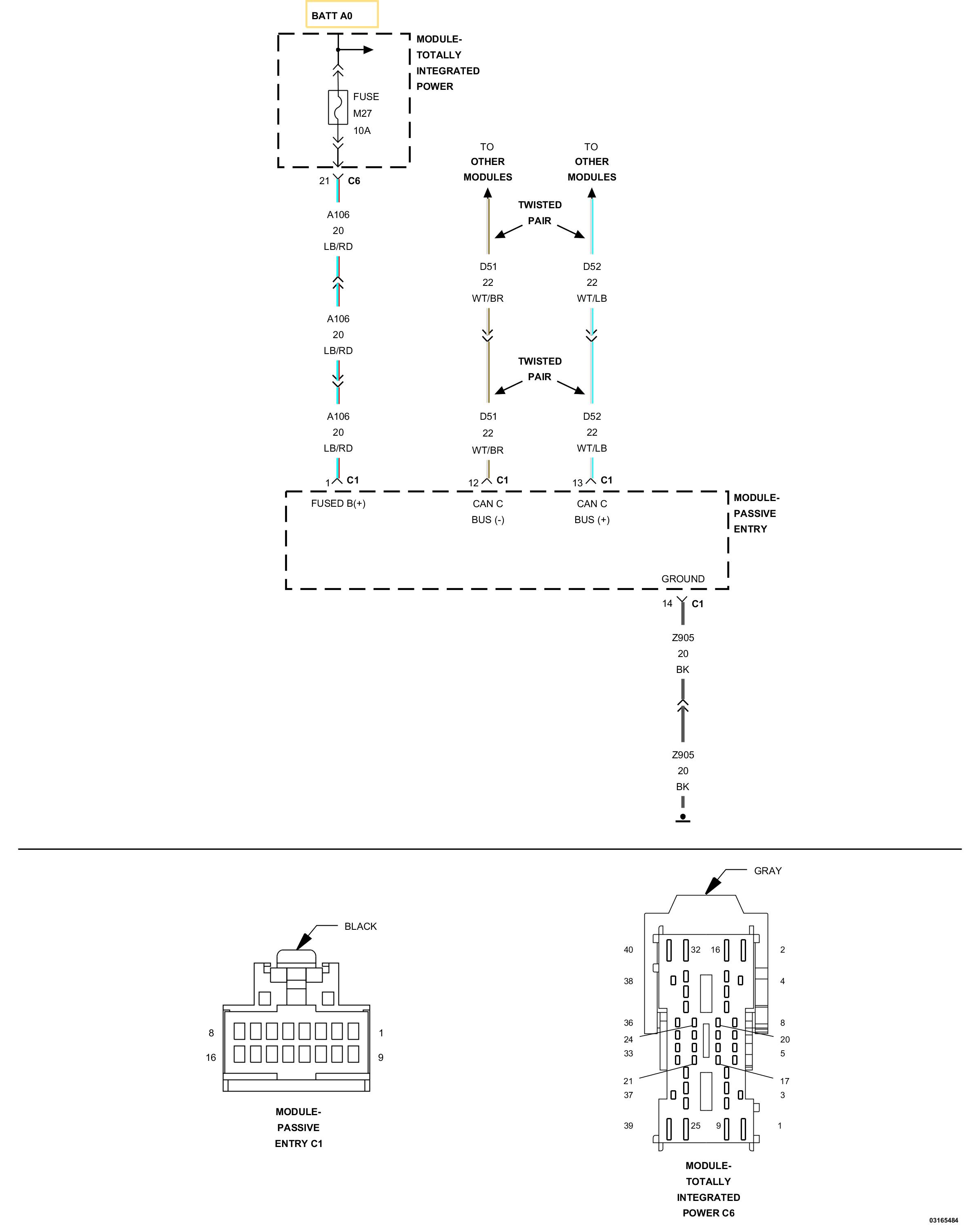 • Measure the resistance of the (D52) CAN C Bus (+) circuit between the PEM C1 harness connector and the TIPM C7 harness connector.