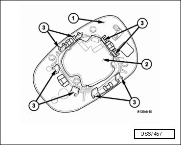 - Position the mirror glass holder (1) to the mirror assembly and align the eight mirror glass retaining clips (3) to the mirror motor (2).