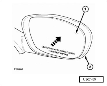 - Using one hand, carefully push the mirror glass holder (1) onto the mirror motor, while at the same time supporting the mirror housing (2) from the backside with the other hand. Firmly push on the mirror glass holder until all eight mirror glass retaining clips are fully engaged.