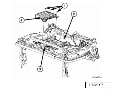 - Remove the push pin retainers (1) securing the module and bracket (4) to the seat pan (2).