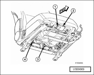 The Heated Seat Module (HSM) (2), also know as the comfort seat wheel module, is located under the driver side front seat. It has a single electrical connector (1) and a push pin style retainer that secures it to the seat pan. The module can be accessed for service from under the driver seat.