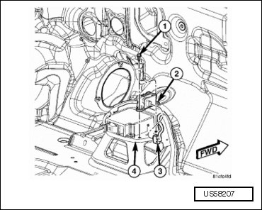 The dynamics sensor (2) is secured with two screws to a stamped steel mounting bracket (4) welded onto the top of the floor pan transmission tunnel near the base of the dash panel, just forward on the center instrument panel support in the passenger compartment. It is mounted next to the occupant restraint controller.