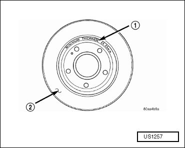 • All brake rotors (2) have markings for minimum allowable thickness cast on an unmachined surface of the rotor (1) or stamped into the hat section. Minimum thickness specifications can also be found in this component's specification table. Refer to => [ Brake Rotor Specifications ] [1][2]Brake Rotor/Disc.