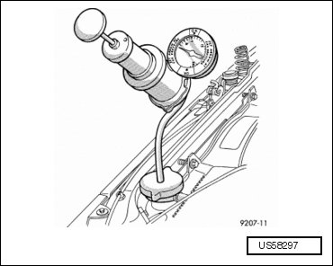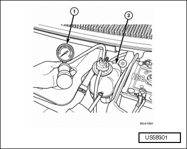 Attach the cooling system tester 7700 or equivalent to the radiator and apply 104 kPa (15 psi) pressure. If the pressure drops more than 13.8 kPa (2 psi) in 2 minutes, inspect all points for external leaks.