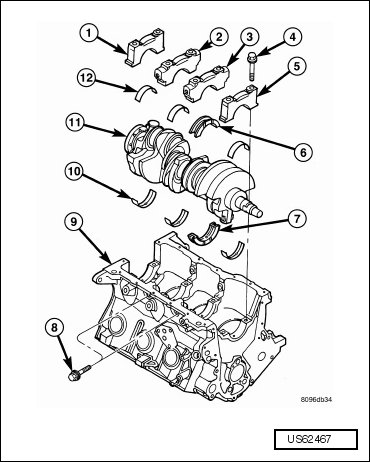 - Lubricate with engine oil and install the crankshaft main bearing halves (7 and 10) to the engine block.