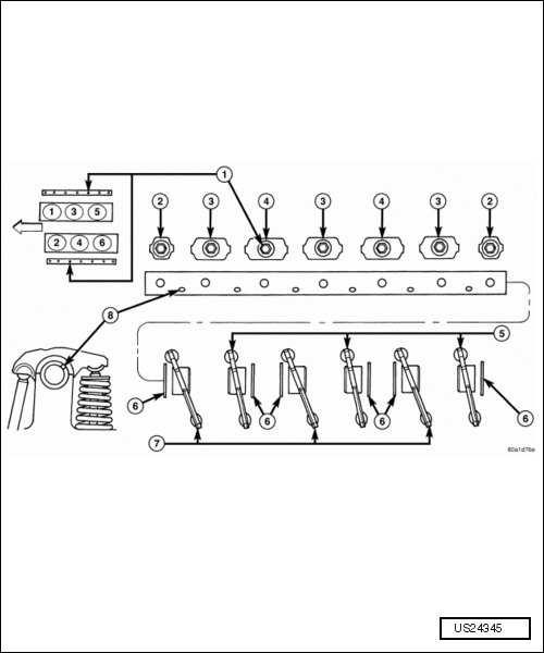 - Remove the rocker arms (7). Identify the component locations for reassembly in their original locations.