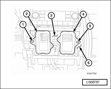 - Remove the screw (1 and 5) that secures each center instrument panel duct (2 and 4) to the instrument panel support (6).