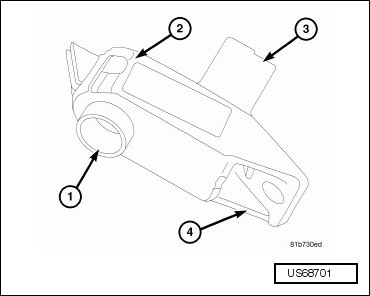 The infrared sensor is used only on models equipped with the automatic temperature control HVAC system. The infrared sensor is located in the front overhead console. The infrared transducer consists of an infrared transducer (1) contained within a black molded plastic housing (2) with an integral wire connector receptacle (3). The integral mounting tab (4) allows the infrared sensor to be secured with one screw to the overhead console.
