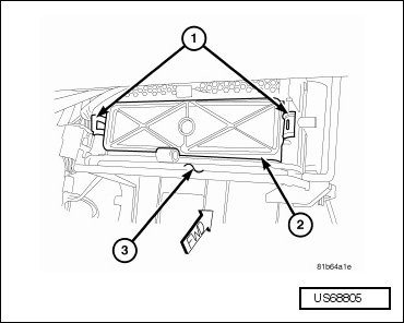 - Disengage the two retaining tabs (1) that secure the particulate air filter cover (2) to the passenger side of the HVAC air distribution housing (3) and remove the cover.
