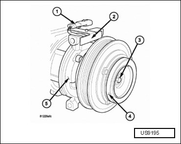- Install the clutch plate (4) onto the front of the A/C compressor (5).