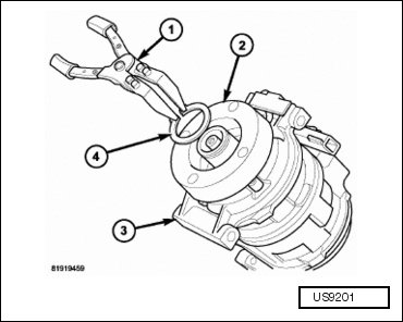 - Using Snap Ring Pliers (9764) (1) or equivalent, remove the snap ring (4) that secures the compressor clutch field coil (2) to the front of the A/C compressor (3) and remove the field coil.