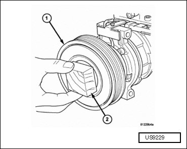 - Install the pulley and bearing assembly (1) onto the front of the A/C compressor. If necessary, tap the pulley gently with a block of wood (2) placed on the pulley friction surface.
