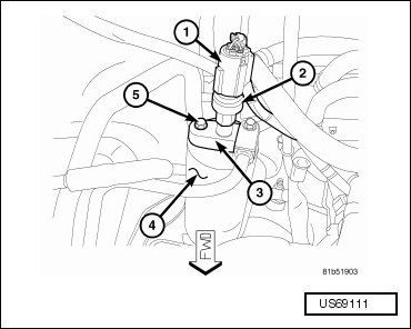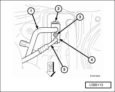 - Remove the nut (3) that secures the A/C suction line (1) and the A/C liquid line (5) to the A/C expansion valve (2).