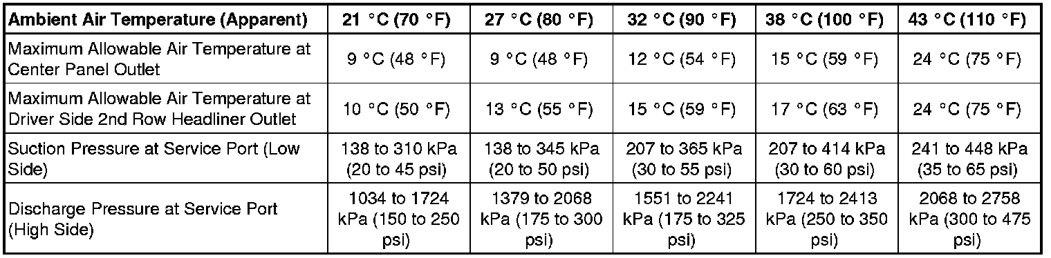 • A/C heater controls set to recirculation mode, full cool, panel mode, high blower and with A/C compressor engaged. If the A/C compressor does not engage, see the A/C System Diagnosis table.
