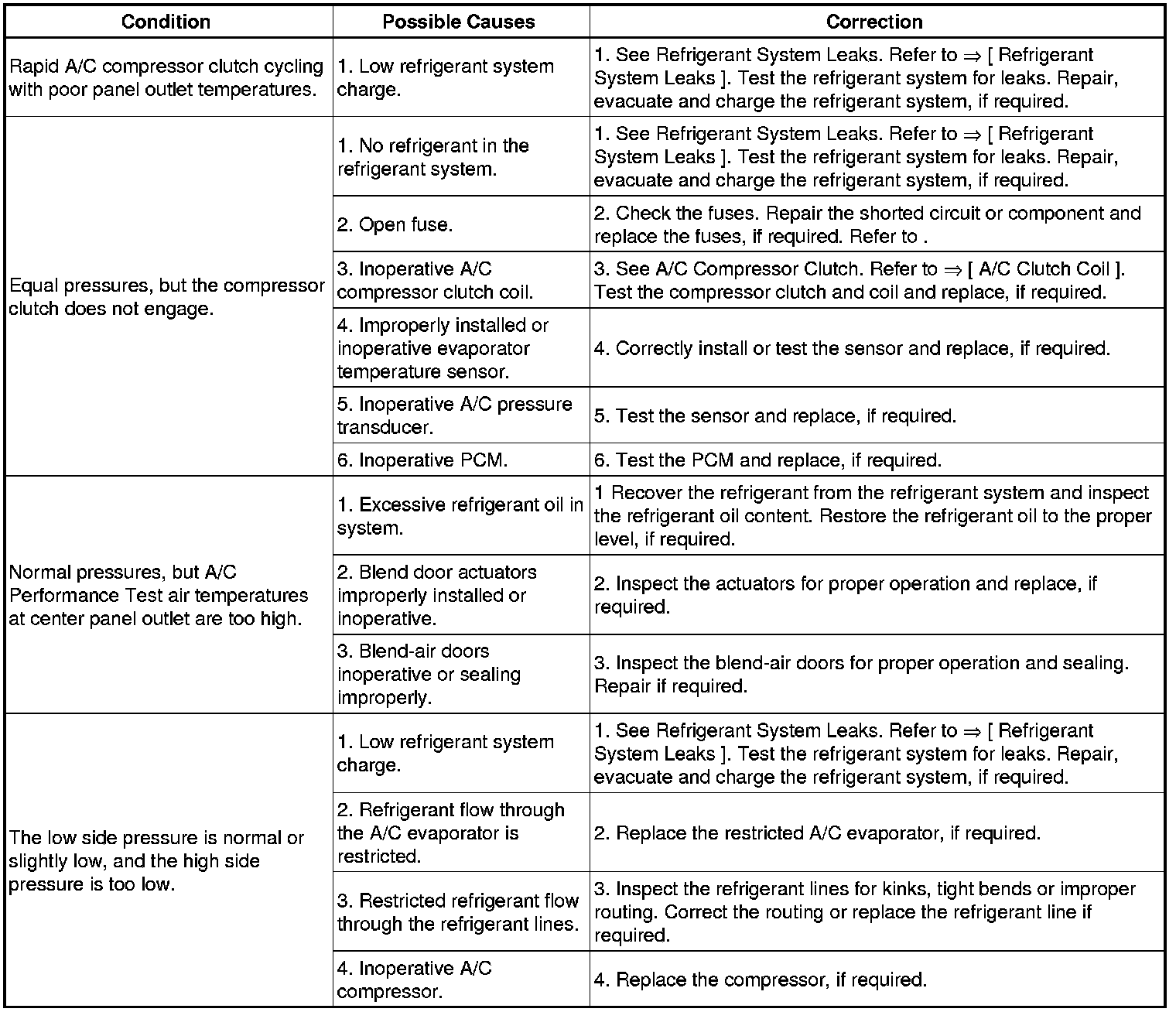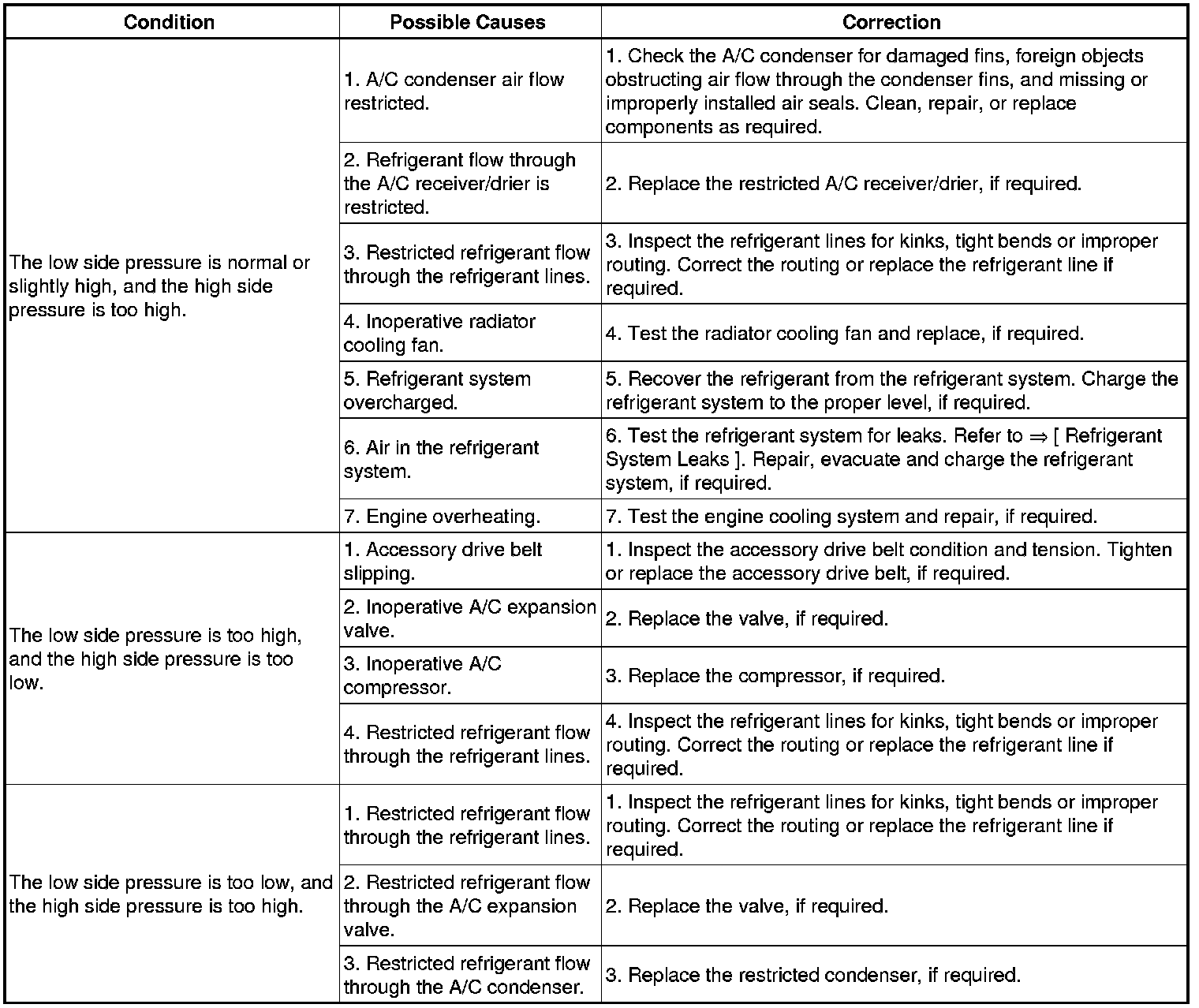 - If the air outlet temperature fails to meet the specifications in the A/C Performance Temperature and Pressure chart, or if the compressor discharge pressure is high, see the A/C System Diagnosis table.