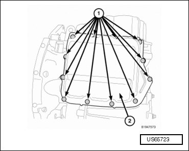 - Loosen the fluid filter oil pan bolts (1) and tap the pan (2) at one corner in order to loosen the pan allowing the fluid to drain, then remove the oil pan.