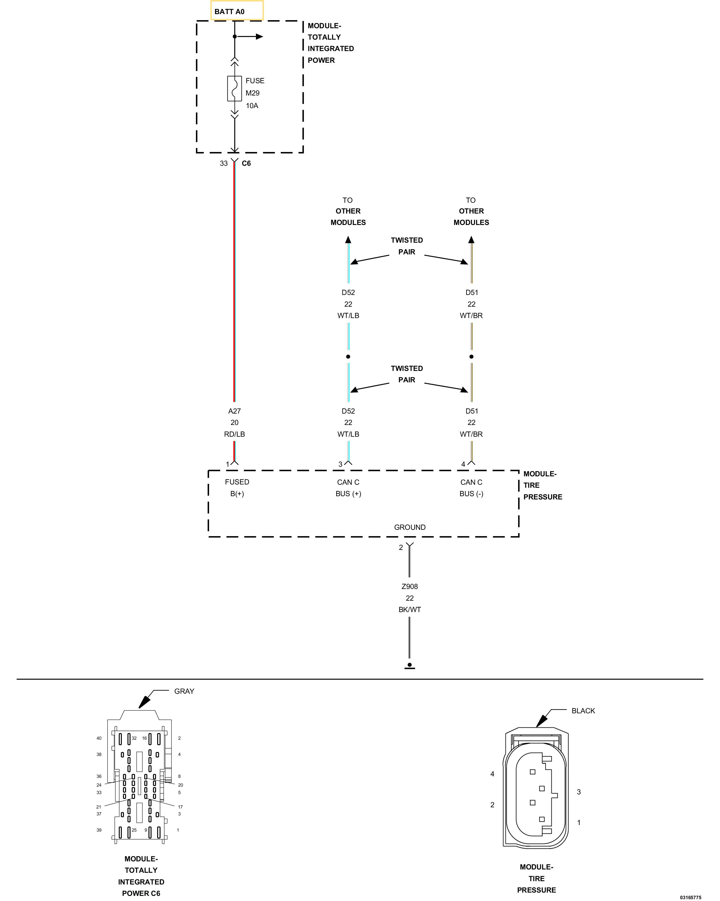 • Measure the resistance of the (D52) CAN C Bus (+) circuit between the TIPM C7 harness connector and the Tire Pressure Module harness connector.