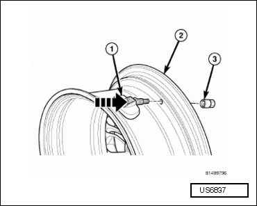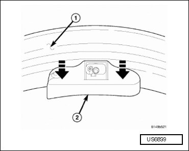 - Insert sensor (1) through wheel (2) as shown keeping pressure against rear of metal valve stem - arrow -. Potted side of sensor is to be positioned toward wheel. Do not attempt to mount sensor otherwise, damage may occur.