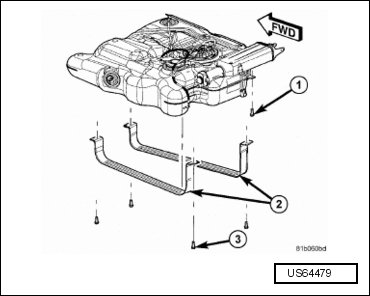 - Loosen the front fuel tank strap bolts (3) but do not remove.
