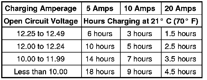 - Battery chargers vary in the amount of voltage and current they provide. The amount of time required for a battery to accept measurable charging current at various voltages is shown in the charge rate table. If the charging current is still not measurable at the end of the charging time, the battery is faulty and must be replaced. If the charging current is measurable during the charging time, the battery may be good and the charging should be completed in the normal manner.