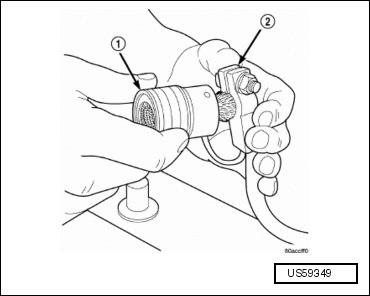 - Clean the battery cable terminal clamps (2) of all corrosion. Remove any corrosion using a wire brush (1) or a post and terminal cleaning tool, and a sodium bicarbonate (baking soda) and warm water cleaning solution.