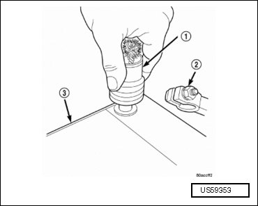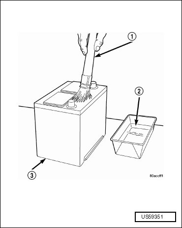 - If the removed battery is to be reinstalled, clean the outside of the battery case (3) and the top cover with a sodium bicarbonate (baking soda) and warm water cleaning solution using a stiff bristle parts cleaning brush (1) to remove any acid film. Rinse the battery with clean water. Ensure that the cleaning solution does not enter the battery cells through the vent holes. If the battery is being replaced, for the factory installed battery specifications. Confirm that the replacement battery is the correct size and has the correct ratings for the vehicle. Refer to => [ Battery Specifications ] [1][2]Battery.