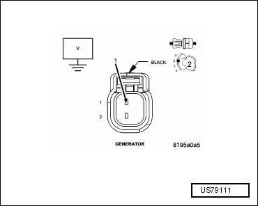 • Using a voltmeter, perform a voltage drop test by backprobing the generator field control circuit at the generator harness connector and probing the appropriate terminal of the special tool #8815. Make sure the voltmeter leads are connected so that positive polarity is displayed on the voltmeter.