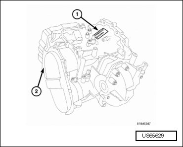 The 62TE transaxle is identified by a barcode label (1) that is fixed to the transaxle case or the "PK" number (2).