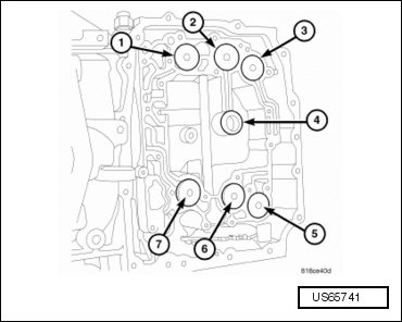 - Remove the six accumulators (1, 2, 3, 5, 6 and 7) from the case along with the accumulator return springs.