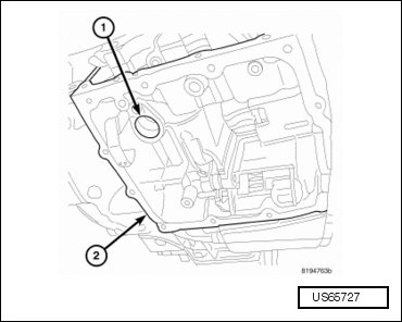 - Remove the pressure tap plug (2) from the valve body oil pan.