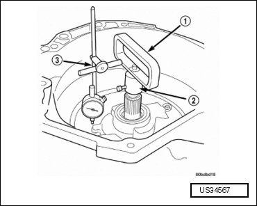 - Measure the input shaft end play. Place the transaxle so the input shaft is vertical. Set up the end play socket set (8266A) (1 and 2) and the dial indicator (3). Check the end play, the reading should be within 0.13 to 0.64 mm (0.005 to 0.025 in). Record indicator reading for reference upon reassembly.