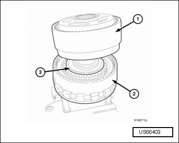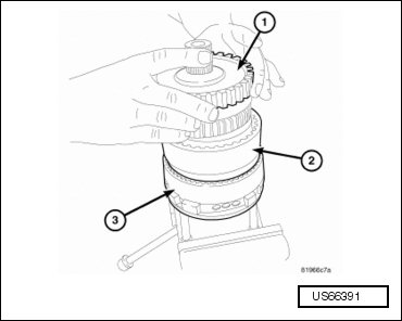 - Remove the overrunning clutch (1) from the low clutch (2).