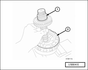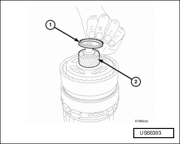 - Install the planetary gear set/output hub (1) onto the direct clutch (2).