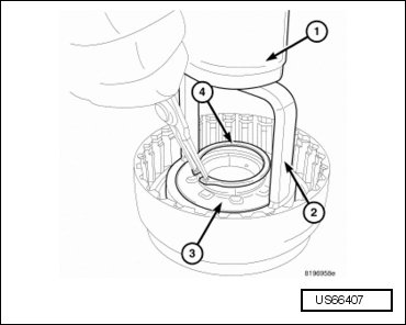 - Compress the spring in order to install the snap ring (4) for the direct clutch balance piston.
