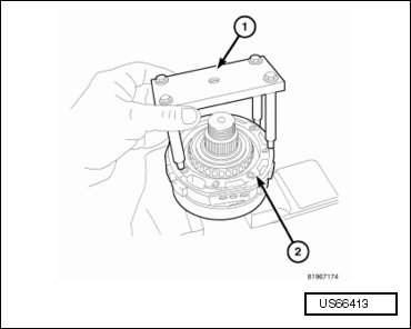 - Install the low clutch return spring (1) over the low clutch retainer (2).